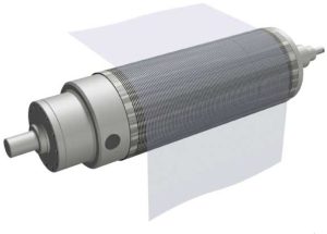 本ロールの基本的構造は、アルミ押出材にスリットを設け、このスリットに対して直角にワイヤーを任意の間隔を持って巻きます。ブロワーによりワイヤーの隙間から減圧し、搬送物を既定の抱角度に吸着する構造です。