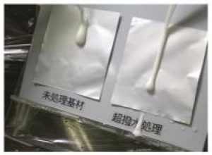 水はもちろん、ヨーグルトや粘り気のあるシロップ等も弾く。汚れ防止や液残りの低減に役立つほか、食品包装容器への利用が可能である。